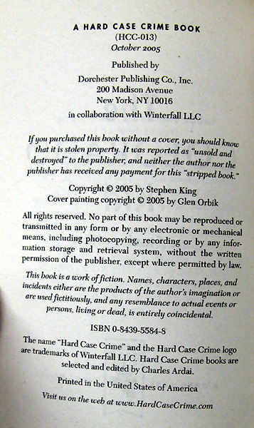 PLEASE NOTE: This information has been confirmed with Mr. Charles Ardi of Hard Case Publishing. As best as anyone can tell - including the publisher - the above information is accurate and the only way to identify a first edition, first printing. Prior to publication, Hard Case mailed out 3 x 5 cards with the graphics for the front and rear covers of the book. These 3 x 5 cards are identical to the book we are offering. This, then, is the earliest known state of the book. Mr. Gary Shulze, owner of "Once Upon A Crime" in Minneapolis, Minnesota, a dedicated collector of the "Hard Case" editions, confirmed this information - via e-mail - with Mr. Charles Ardi of Hard Case Publishing. We have been authorized to attach this information to this listing.