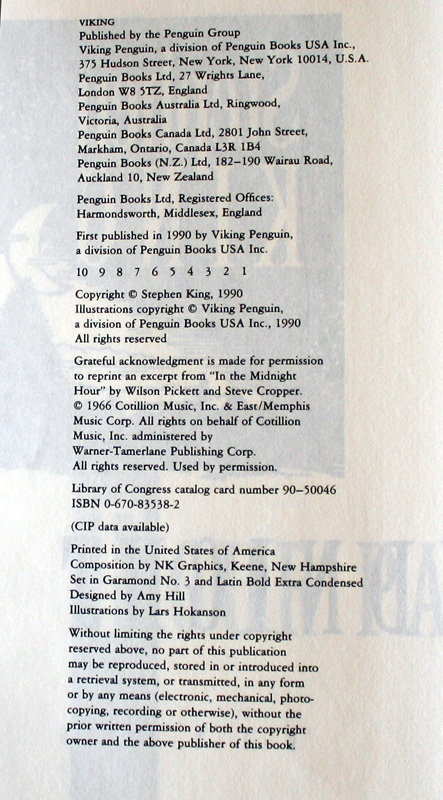 A first edition of 1,500,000 copies. Issued with a dustjacket, yellow endpapers, and price of $22.95. The copyright page will have the numbers 10 9 8 7 6 5 4 3 2 1. The first state has "Stephen King" in gold on the front cover. The second state does not. Current Value = $10 - $20