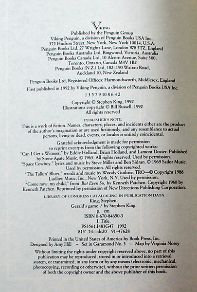 • A first edition of 1,500,000 copies. Issued with a dustjacket and price of $23.50. "First published in 1992 by Viking Penguin" as well as the numbers 1 3 5 7 9 10 8 6 4 2 should be on the copyright page. Current Value = $10-$15