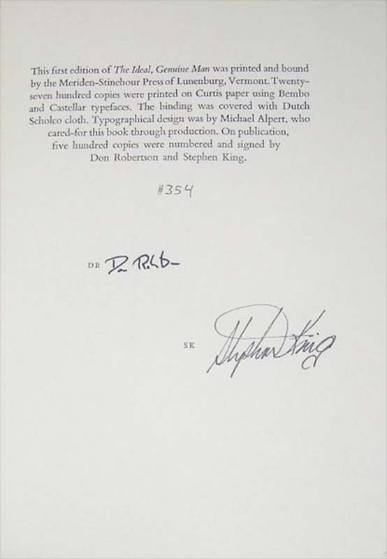 - Signed Numbered Edition of 500 copies issued with a dustjacket (no slipcase). Signed by Stephen King and and Don Robertson . Issue price = $50