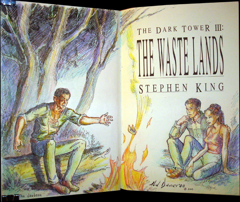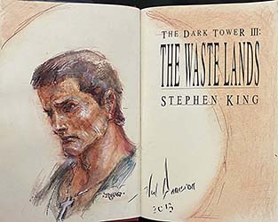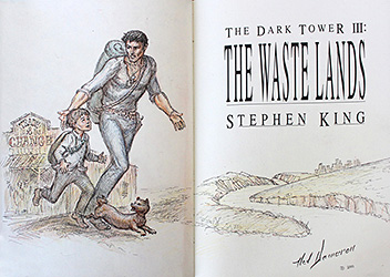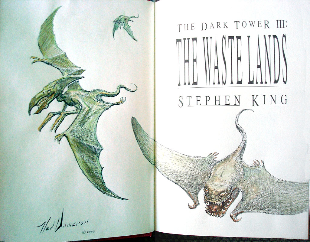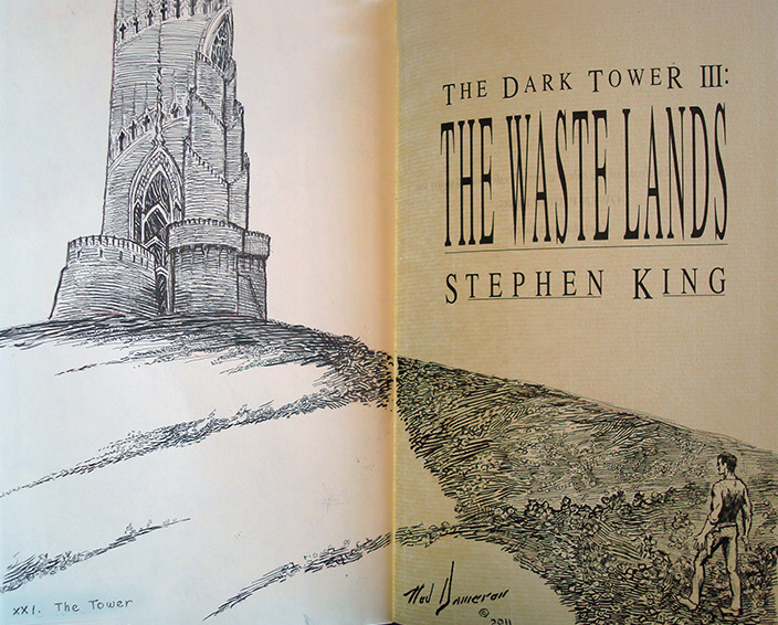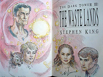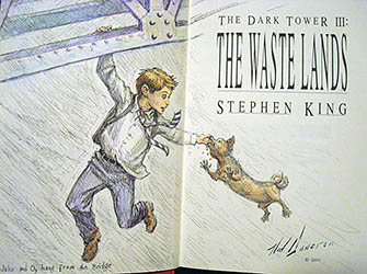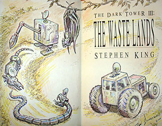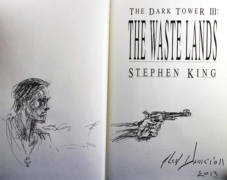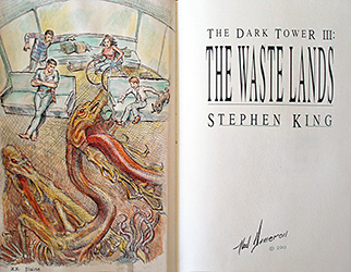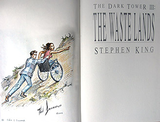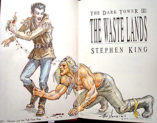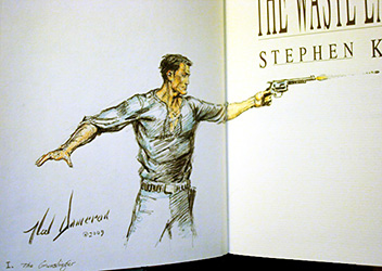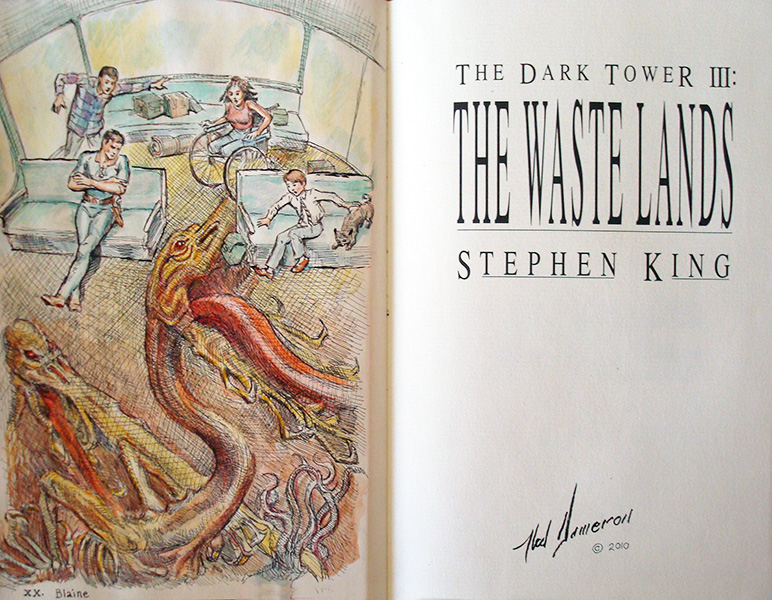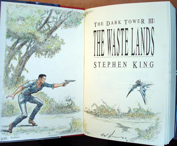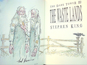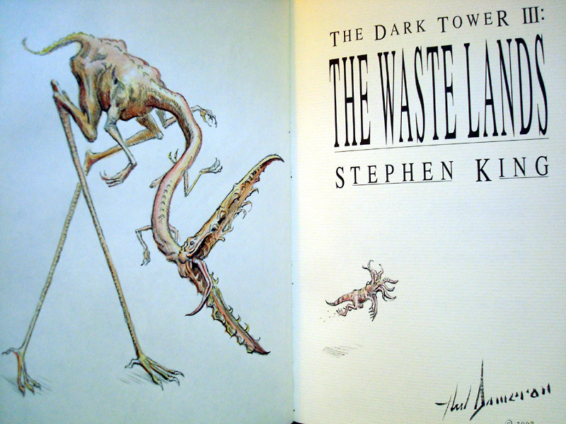 In July of 2009, artist Ned Dameron announced he would be doing remarques in twenty-one copies of the Grant first edition of The Waste Lands. Over a period of about 18 months, Dameron (who produced the original illustrations for the book) released these for sale via eBay. Each remarque was numbered and signed by the artist.