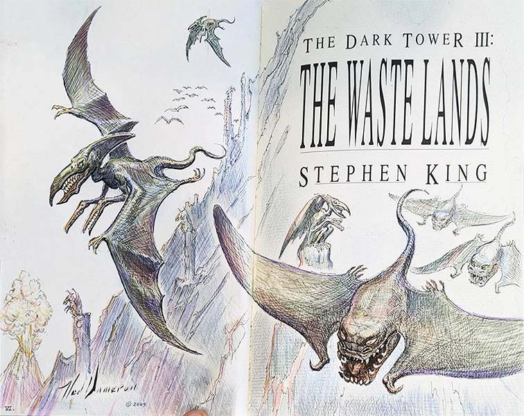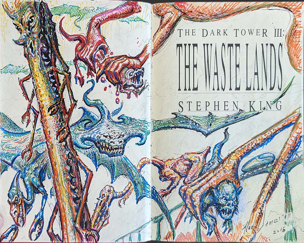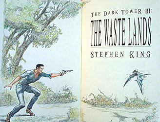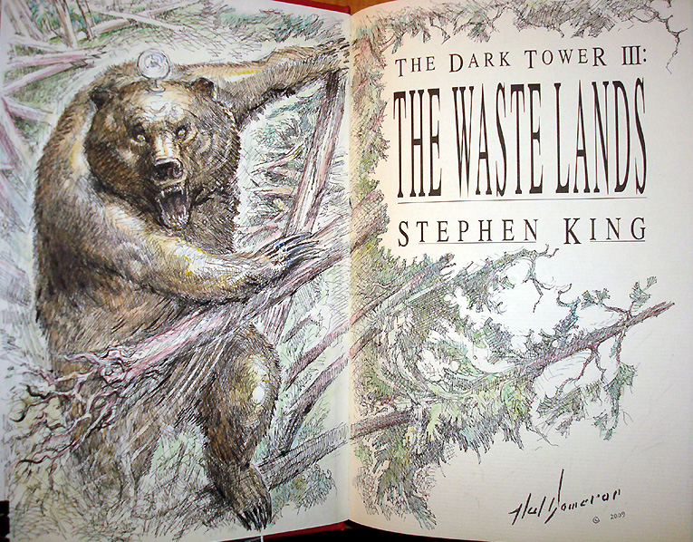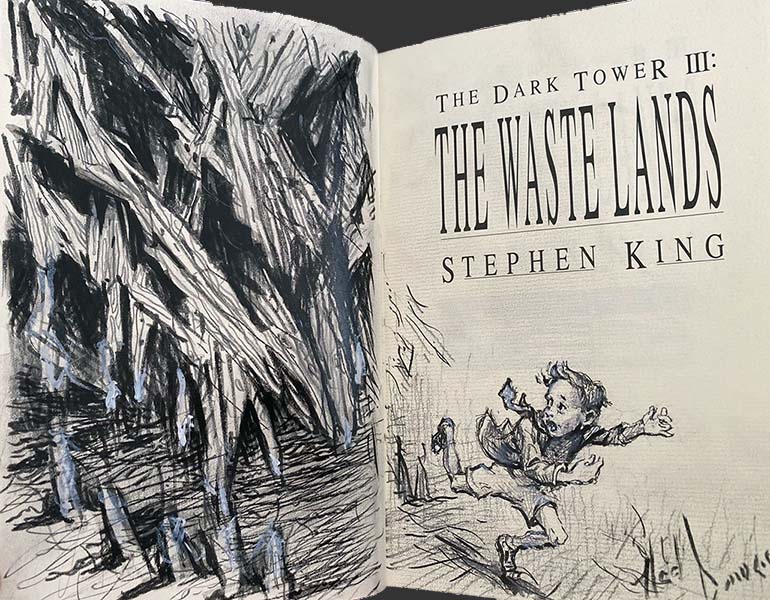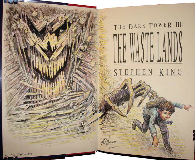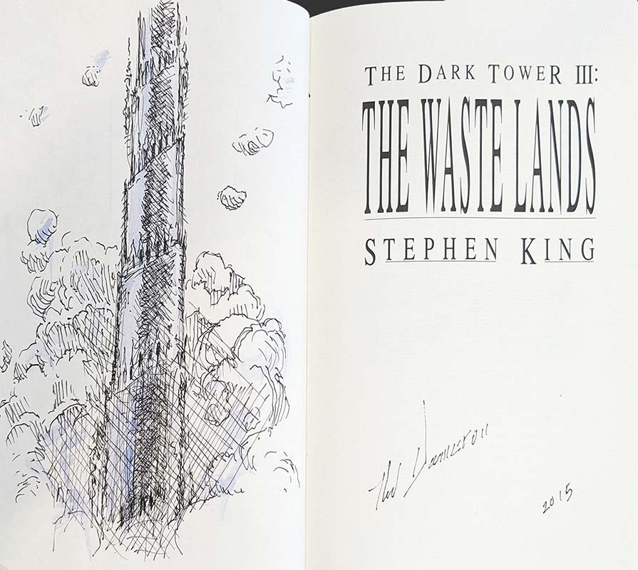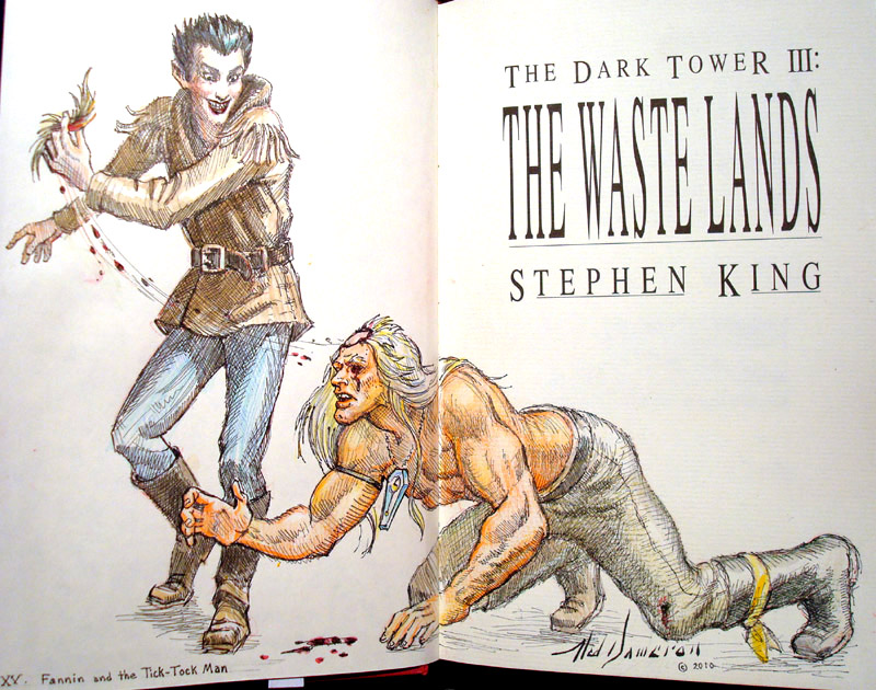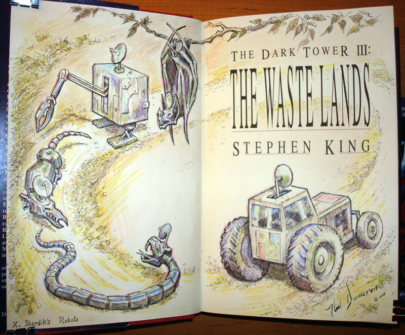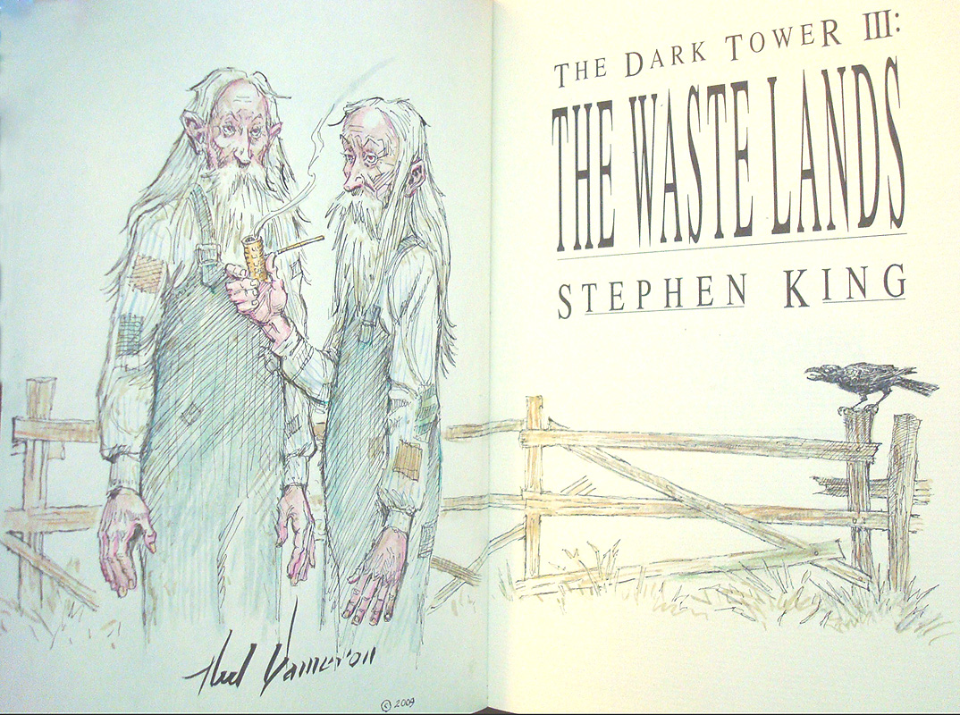 In July of 2009, artist Ned Dameron announced he would be doing remarques in twenty-one copies of the Grant first edition of The Waste Lands. Over a period of about 18 months, Dameron (who produced the original illustrations for the book) released these for sale via eBay. Each remarque was numbered and signed by the artist.