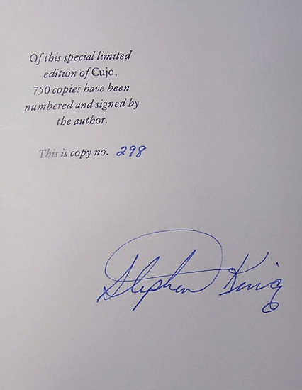 - A limited edition of 750 signed and numbered copies, with an acetate cover and a slipcase. Sold originally for $75. The limitation page reads: "Of this special limited edition of Cujo, 750 copies have been numbered and signed by the author, This copy no. _____ $1,100-$1,500