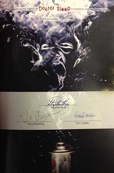 In an interesting move to capture the growing remarque market, Cemetery Dance annouced in February 2013 that they were allowing 100 customers to get their copies of Dr. Sleep remarqued by Vincent Chong for $199. Those customers would have the original art tipped into the book. Then in March they opened up the same option for Erin Wells for $149. A couple weeks later they annouced a THIRD remarque option for Glenn Chadbourne at $199...Chadbourne did not actually illustrate the limited or gift editions, but he contributed drawings for the end papers in the gift edition.