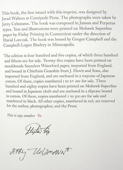 - 25 deluxe copies bound in goatskin and enclosed in a traycase lined with japanese cotton; Fifteen of these massive books (numbered I - XV in black ink) were available for sale, the others were numbered I - X in red ink. Jerad decided to use roman numerals because he felt that they were much more elegant that letters. $17,500 - $25,000 (est)
